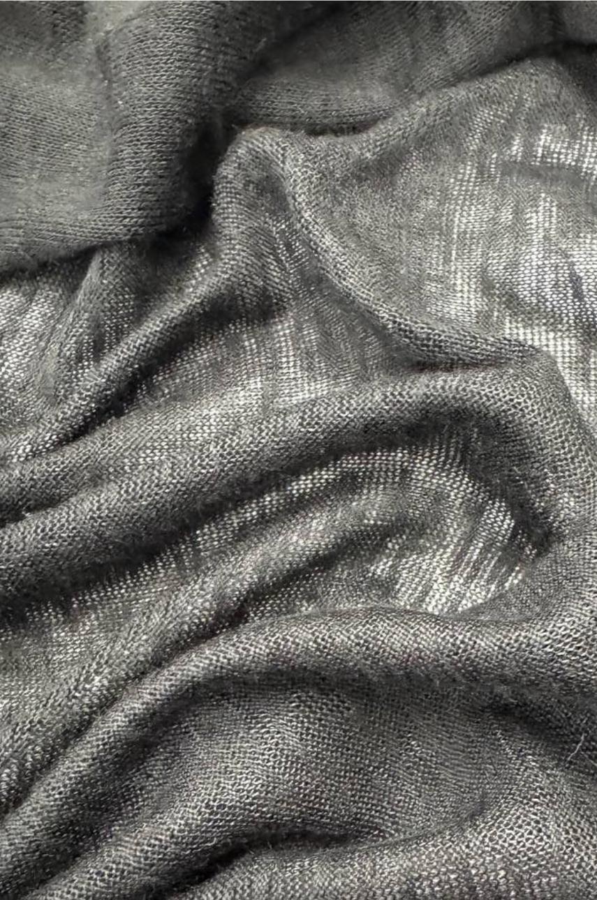 Поливискон Фламли Черный - тонкое, нежное, полупрозрачное трикотажное полотно с характерным штриховым рисунком "березки", образованным за счет переплетения нитей. Идеально подходит для одежды второго слоя: лонгсливов, кардиганов, платьев, легких костюмов. Изделия из этого полотна выглядят нежно и в то же время эффектно, приковывая к себе внимание.